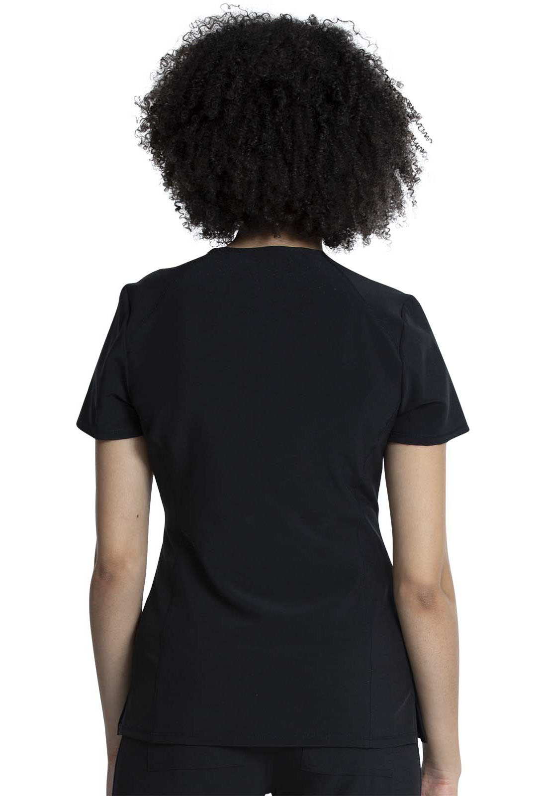 Contemporary V-neck top with three pockets, side vents, 360° stretch, and moisture-wicking fabric.