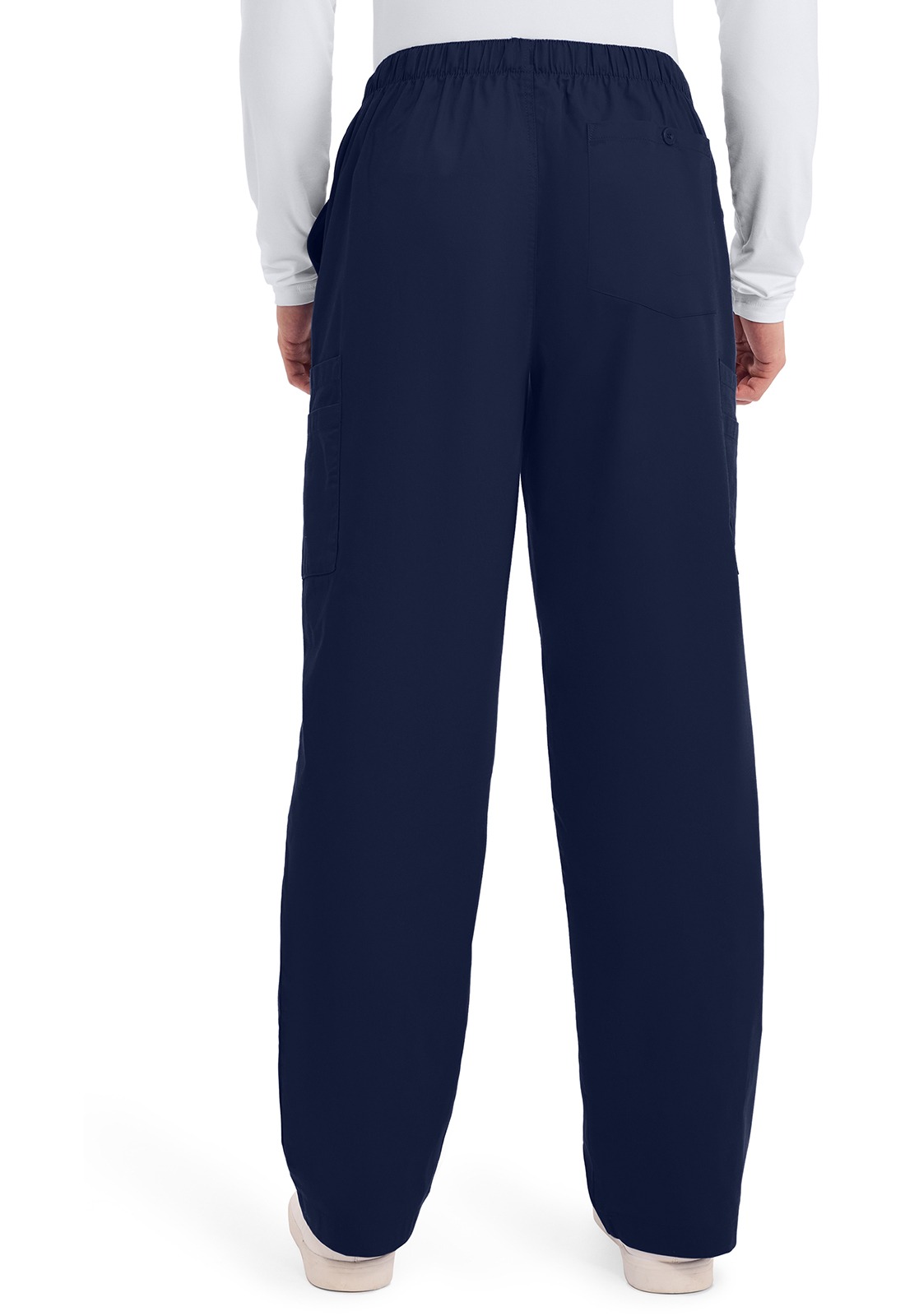 A Men’s natural rise elastic waist pant features a reinforced adjustable drawstring, a functional zip fly, two slash pockets, four side cargo pockets, and a back patch pocket with button closure for added security.